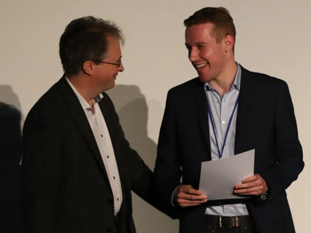 Jury-Mitglied Wilm Hüffer mit dem Gewinner des ersten Preises: Jakub Drogowski (links). Foto: Carl Marciniak