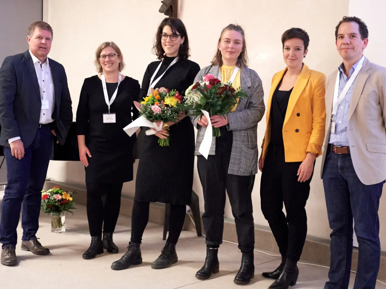 Auf dem Foto von links: Gottfried Bohl (Fifp), Katja Auer (Fifp), die Preisträgerinnen Miriam Dahlinger und Franziska Martin, Miriam Steimer (Fifp), Kassian Stroh (Jury). Nicht auf dem Foto: Preisträger Leonard Scharfenberg. Foto: Korbinian Bauer